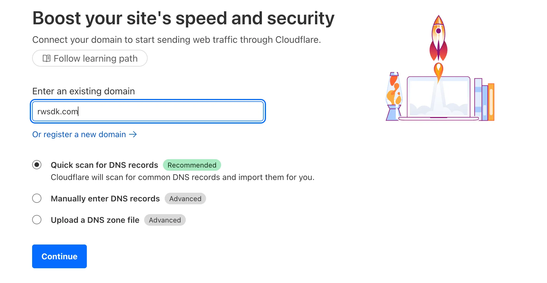 Once you’ve updated your nameservers, go back to Cloudflare and click Continue.